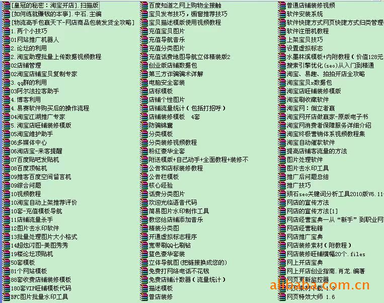 1:千戀導(dǎo)購(gòu)網(wǎng)學(xué)習(xí)法2:SNS網(wǎng)店軟文推廣法3:SNS網(wǎng)店API合作推廣法4:收藏夾推廣法5:版主聯(lián)盟推廣法6:回復(fù)置頂推廣法7:有獎(jiǎng)注冊(cè)推廣法8:QQ群推廣法9:搜索引擎推廣法10:軟文推廣法11:博客推廣法12:媒體推廣法13:手機(jī)推廣法14:網(wǎng)摘推廣法15:論壇推廣法16:第三極推廣法17:QQ和MSN昵稱推廣法18:郵件列表推廣法19:非預(yù)期郵件推廣法20:口碑推廣法21:口碑推廣法22:網(wǎng)店排名投票推廣法23:聚合鏈接推廣法24:BT電爐哇嘎資源推廣法25:圖片打水印推廣法26:視頻源Flash推廣法27:提交到網(wǎng)址站推廣法28:電子郵件自動(dòng)回復(fù)推廣法29:無(wú)償單向鏈接推廣法30:網(wǎng)店間互換鏈接推廣法31:批量提交交換鏈接推廣法32:網(wǎng)店推廣聯(lián)盟推廣法33:流量統(tǒng)計(jì)推廣法34:互換頻道推廣法35:免費(fèi)資源推廣法36:內(nèi)容聯(lián)盟推廣法37:威逼強(qiáng)迫推廣法38:做大做強(qiáng)推廣法39:客戶端軟件插件推廣法40:收費(fèi)資源免費(fèi)推廣法41:群組推廣法42:發(fā)布任務(wù)推廣法43:印發(fā)宣傳單線下宣傳推廣法44:流量交換聯(lián)盟推廣法45:鼓勵(lì)訪客宣傳推廣法46:名片推廣法47:電子郵件簽名推廣法48:網(wǎng)上競(jìng)賽推廣法49:付費(fèi)推廣法50:分工合作推廣法51:按效果付費(fèi)推廣法52:設(shè)為主頁(yè)和加入收藏推廣法53:廁所繪畫推廣法54:搞活動(dòng)推廣法55:廣場(chǎng)效應(yīng)推廣法56:賀卡推廣法57:事件連鎖反應(yīng)推廣法58:?jiǎn)柎鹁W(wǎng)店推廣法59:百科網(wǎng)店推廣法60:RSS推廣法61:網(wǎng)吧推廣法62:站長(zhǎng)交流推廣法63:網(wǎng)頁(yè)病毒推廣法64:過(guò)路費(fèi)推廣法65:域名推廣法66:分類信息推廣法67:免費(fèi)域名推廣法68:聊天室推廣法6969:演講推廣法70:特殊資源推廣法71:模仿推廣法72:被動(dòng)推廣法73:化整為零推廣法74:預(yù)告推廣法75:創(chuàng)建品牌推廣法76:多語(yǔ)言版本推廣法77:免費(fèi)建站程序推廣法78:網(wǎng)店模板推廣法79:講故事出書(shū)推廣法80:創(chuàng)造新概念推廣法81:改名推廣法82:月歷墻紙推廣法83:征婚推廣法84:公交車站推廣法85:地圖推廣法86:吹捧推廣法87:出入口推廣法88:招聘推廣法89:立碑推廣法90:故事推廣法91:信仰推廣法92:贊助推廣法93:公共元素推廣法94:線下實(shí)物推廣法95:免費(fèi)算命推廣法96:與朋友分享獨(dú)門秘籍推廣法97:賣站推廣法98:人工扛牌推廣法99:圖書(shū)推廣法100:免費(fèi)贈(zèng)送推廣法101:修電腦推廣法102:媒體聯(lián)合推廣法103:作小推廣法104:作大推廣法105:模仿推廣法106:熱點(diǎn)推廣法107:博客評(píng)論推廣法108:博客評(píng)論推廣法109:最后一條是無(wú)為而治重點(diǎn)作好站的內(nèi)容就行了