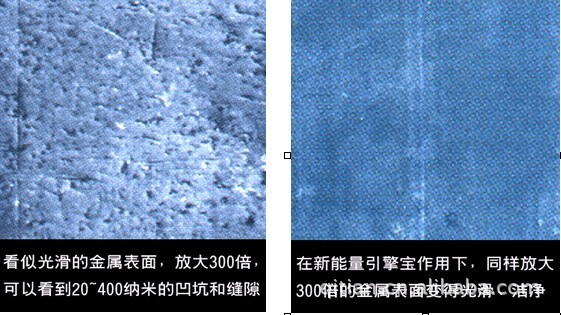 我的工作原理可以從我的名字知道——調(diào)理金屬,抵御摩擦——在熱和壓力作用下,納米粒子填補金屬表面微小凹坑,并強化金屬表面硬度。從而降低摩擦系數(shù),減少80%磨損,達到保護設(shè)備之功效。(有圖為證)