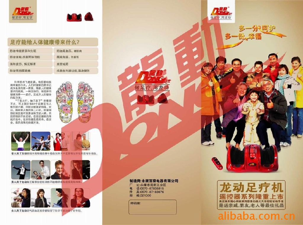 永康市百榮電器有限公司的“龍動(dòng)”品牌高品質(zhì)足療機(jī)推出市場(chǎng)以來(lái),得到了全國(guó)各地經(jīng)銷商的一致好評(píng),“龍動(dòng)”已成為高品質(zhì)的象征!近期我們又隆重推出炫彩系列高品質(zhì)足療機(jī),同時(shí)高調(diào)推出了帶遙控功能系列足療機(jī)!我們正在不斷努力中開(kāi)發(fā)全新系列產(chǎn)品,讓我們?nèi)珖?guó)各地經(jīng)銷商在激烈的商場(chǎng)競(jìng)爭(zhēng)中擁有更多的競(jìng)爭(zhēng)優(yōu)勢(shì)!選擇“龍動(dòng)”是您明智的選擇!
