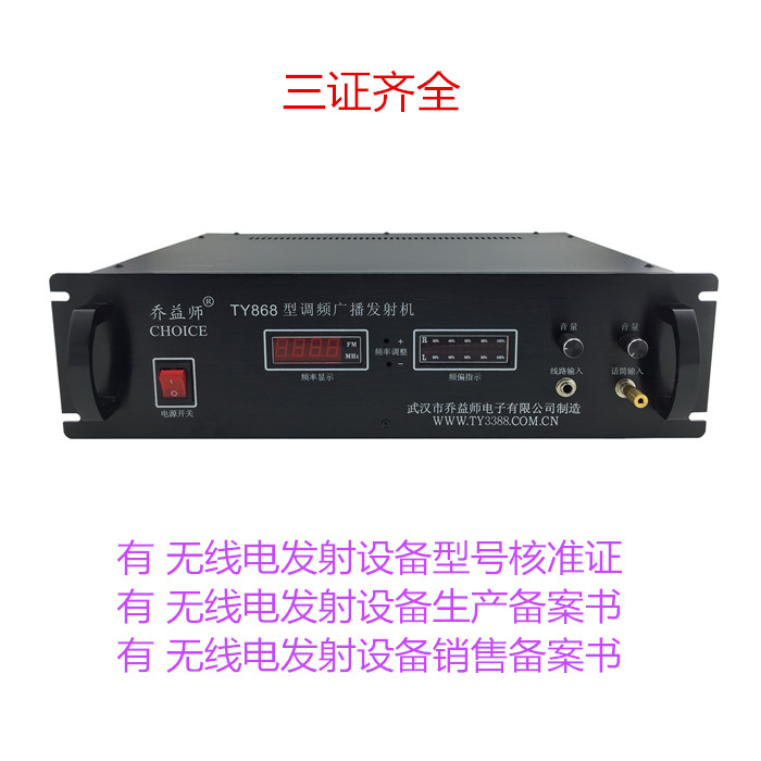 TY868型調(diào)頻發(fā)射機(jī)的是由一臺發(fā)射機(jī)、一根饋線和一根專用發(fā)射天線組成。調(diào)頻信號向空中發(fā)射調(diào)頻電波,供帶有調(diào)頻接收功能的耳機(jī),收音機(jī)接收。該系統(tǒng)可以供學(xué)校播放英語聽力考試內(nèi)容,也可以用在其它場合使用。如果想播放英語聽力內(nèi)容,那么你需要加上一音源:卡座、VCD、MP3均可,只要將音頻信號輸出通過一根帶插頭的連接線輸入到發(fā)射機(jī)的音頻輸入插孔即可。學(xué)校一般配備一臺奇聲卡座比較好,:一般考試都是用磁帶放音;:奇聲卡座有兩個(gè)帶倉,有備用功能;它還有自動循環(huán)放音功能。另外該系統(tǒng)還可以配一個(gè)電腦時(shí)鐘控制器,可以實(shí)現(xiàn)無人置守,自動播放,總之應(yīng)該根據(jù)實(shí)際需要選購音源。TY868-7型調(diào)頻發(fā)射機(jī)適用于全國各大高等院校,工廠,旅游景區(qū),部隊(duì)等場所,有效范圍700米,空曠發(fā)射可達(dá)3公里。TY868-30型調(diào)頻發(fā)射機(jī)有效范圍1500米,空曠發(fā)射可達(dá)10公里。
