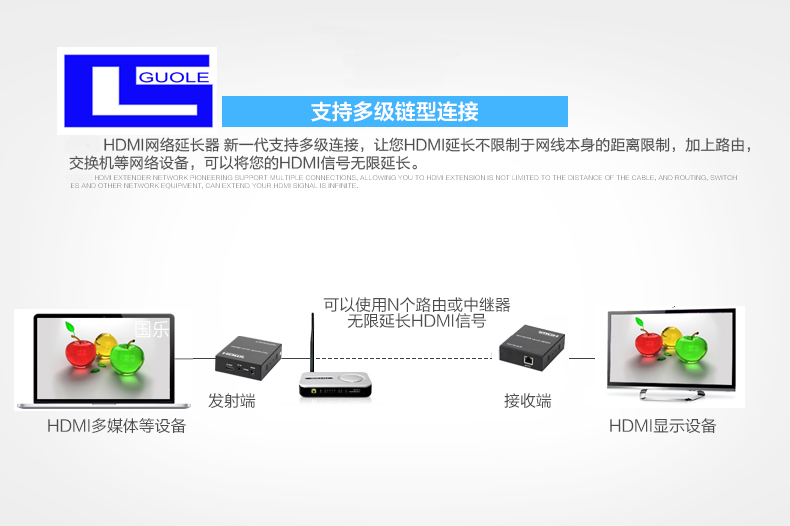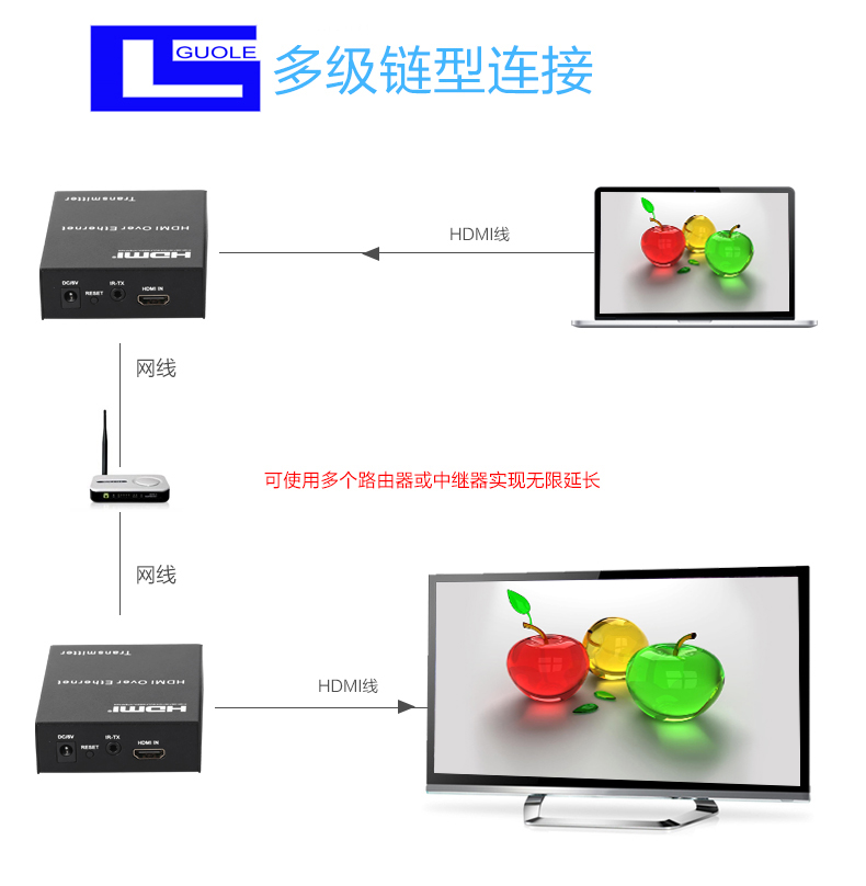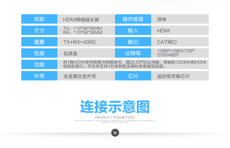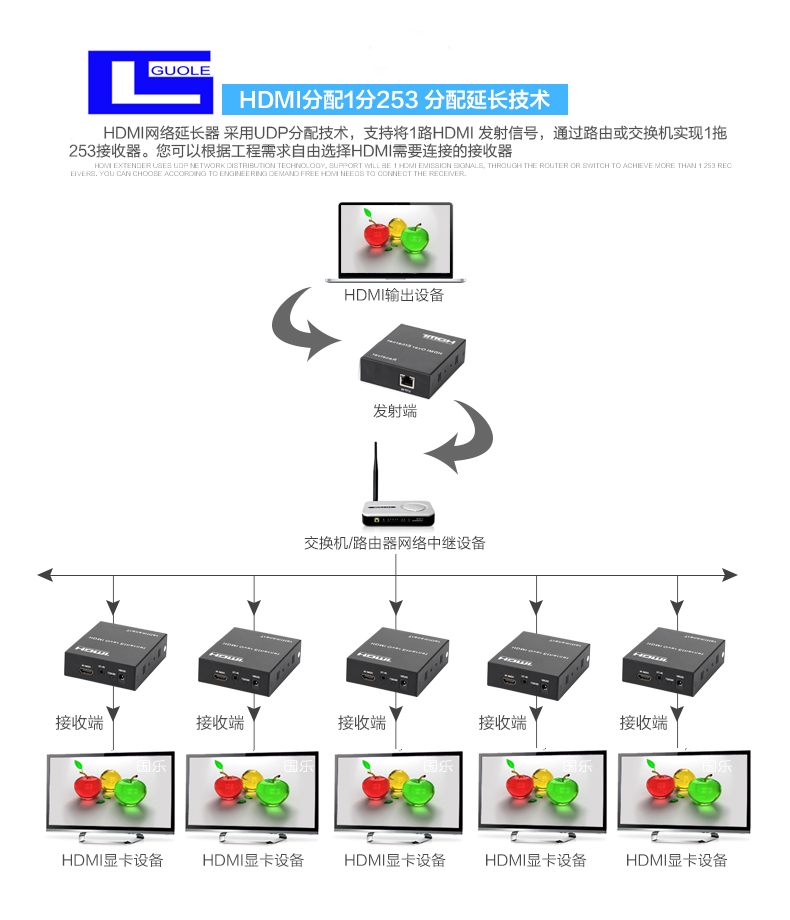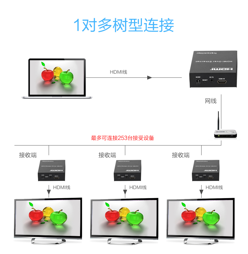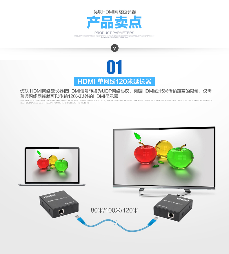 HDMI單網(wǎng)線(xiàn)是采用標(biāo)準(zhǔn)的TCP/IP協(xié)議通過(guò)局域網(wǎng)傳輸高清音視頻的設(shè)備,能將您的 DVD、播放器、電腦等設(shè)備的 HDMI 高清視頻采用CAT5E/6 網(wǎng)線(xiàn)傳輸,距離最遠(yuǎn)可達(dá) 120 米;同時(shí)方便采用點(diǎn)對(duì)點(diǎn),點(diǎn)對(duì)多點(diǎn)、級(jí)聯(lián)的方式進(jìn)行傳輸HDMI 高清音視頻信號(hào)。