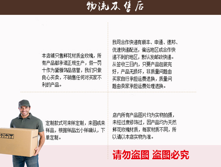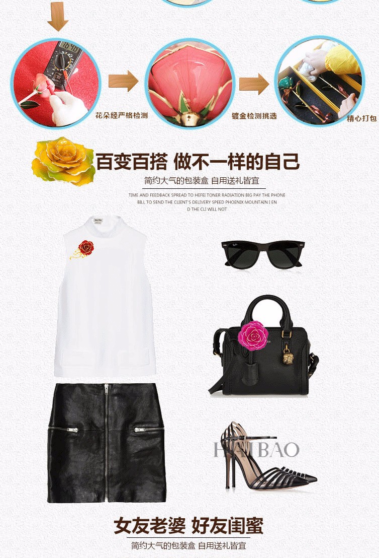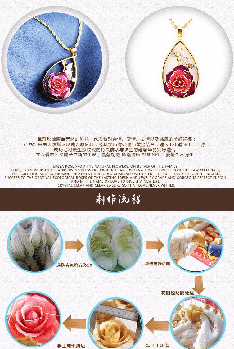【制作工藝】本產(chǎn)品采用新鮮植物鮮花為原料(A級天然鮮花玫瑰材質(zhì)),每一朵都選用天然鮮花,經(jīng)過128道全手工工藝操作,整朵花體采用膠原蛋白樹脂封塑并電鍍金邊裝飾,鮮花晶瑩剔透,脈絡(luò)清晰,栩栩如生,持久鮮活,使自然界中美的瞬間恒久的保存,此產(chǎn)品充滿了浪漫的田園氣息和自然風(fēng)光,而且時尚自然大方,彰顯個性,是饋贈和紀(jì)念之佳作。