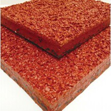 復(fù)合式塑膠跑道 :基礎(chǔ)層為聚氨酯樹脂粘合的黑色環(huán)保橡膠顆粒,面層為有色EPDM橡膠顆粒澆鑄在聚氨酯樹脂中。
