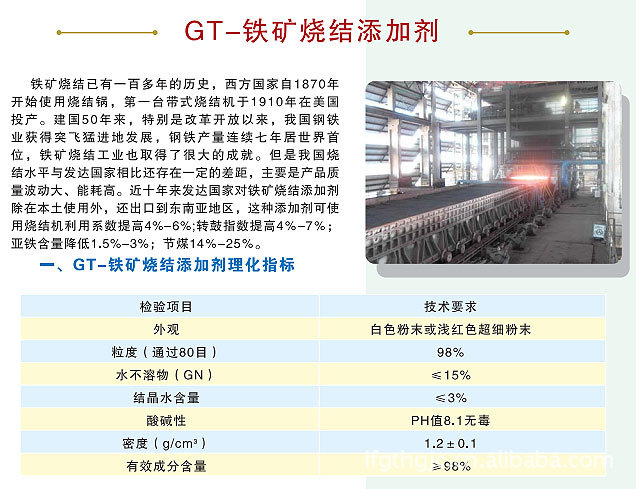 燒結劑其特點為用量更少,是原燒結劑用量的1/4,它以低溫燒結理論和礦物結晶學說為基礎,利用催化技術強化燒結得到合理的燒結礦物組成和礦相結構,是促進高爐增鐵節(jié)焦的專業(yè)前端技術。該技術采用自由基引發(fā)劑促使燒結混合料水分先行氣化燃燒,增強燒結料層的透氣性和蓄熱能力;采用增氧劑提高燒結過程中的氧化性氣氛,促使鐵酸鈣(SFCA)生成和燒結礦還原度(RI)提高;采用助熔劑降低燒結物料的礦化溫度;采用催化劑(α—Fe2O3)提高燒結配碳的燃燒速度和燃燒效率;采用強化劑稀土元素促進燒結固—液相之間的結合與結晶,提高燒結礦強度;采用晶核劑提高硅酸鹽陽陰離子團之間的比值,抑制燒結礦β—C2S晶形轉變時的體積膨脹粉化和低溫還原粉化(RDI)。在各種有效成分的綜合作用下使燒結固體燃耗和FeO同步降低,燒結礦強度提高,粒級組成優(yōu)化,還原度提 作用效果 1、 強化造球制粒,改善料層透氣性,提高垂直燒結速度和燒結機利用系數。 2、 提高燒結燃料的反應活性和燃燒效率,降低FeO和固體燃料消耗。 3、 增強燃燒帶的氧化性氣氛,促進厚料層低溫燒結。 4、 提高粘結相中鐵酸鈣含量,改善燒結礦冶金性能,促進高爐增鐵節(jié)焦。 5、 降低燒結廢氣中SO2生成量,減少環(huán)境污染。 在燒結混合料總量中配加0.1‰的JBX燒結增效劑,燒結機可增產1.5-3%,固體燃料消耗可降低2-5kg/t,燒結礦轉鼓強度可提高1.5-3.5個百分點,槽下返粉率降低1.5-3.5個百分點,燒結礦復合針狀鐵酸鈣含量平均提高8%以上,還原度(RI)平均提高6%以上,RDI和高溫軟熔性能均有明顯改善。 三、理化指標 項目指標 外觀淺棕紅色或粉灰色粉末 粒度 40目過篩≥90% 水不溶物(GN) GN≤55% 水分含量 ≤5% PH值 8-11 密度(g/cm3) 1.2±0.15高,冶金性能得到明顯改善,同時還能抑制燒結礦自然粉化和低溫還原粉化。