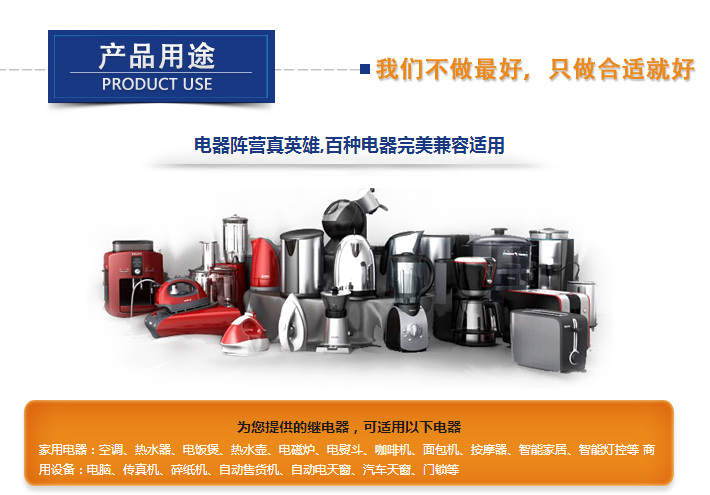 小家電繼電器用途:電熱器、PCB控制板、電磁爐、自動(dòng)售貨機(jī)、電飯鍋、面包機(jī)、智能控制等