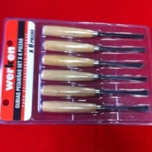 High quality carbon steel and hardwood handles 刀鋒型體 -1.straight chisel, 2.curved chisel, 3.skew chisel, 4.curved gouge, 5.straight gouge, 6.curved "V" tool.6件套木柄全磨雕花鑿, 材料: 45#碳鋼, 木鑿總長(zhǎng)170MM, 款式: 平鑿, 直扁鑿, 彎扁鑿, 直溝鑿, 彎溝鑿, V型鑿, 木鑿表面涂透明防銹油。硬雜木本色木柄長(zhǎng)度90MM, 木柄要求無明顯木疤/洞孔/裂紋, 表面涂透明清漆, 帶鍍鎳金屬園箍??凼诫p泡殼包裝