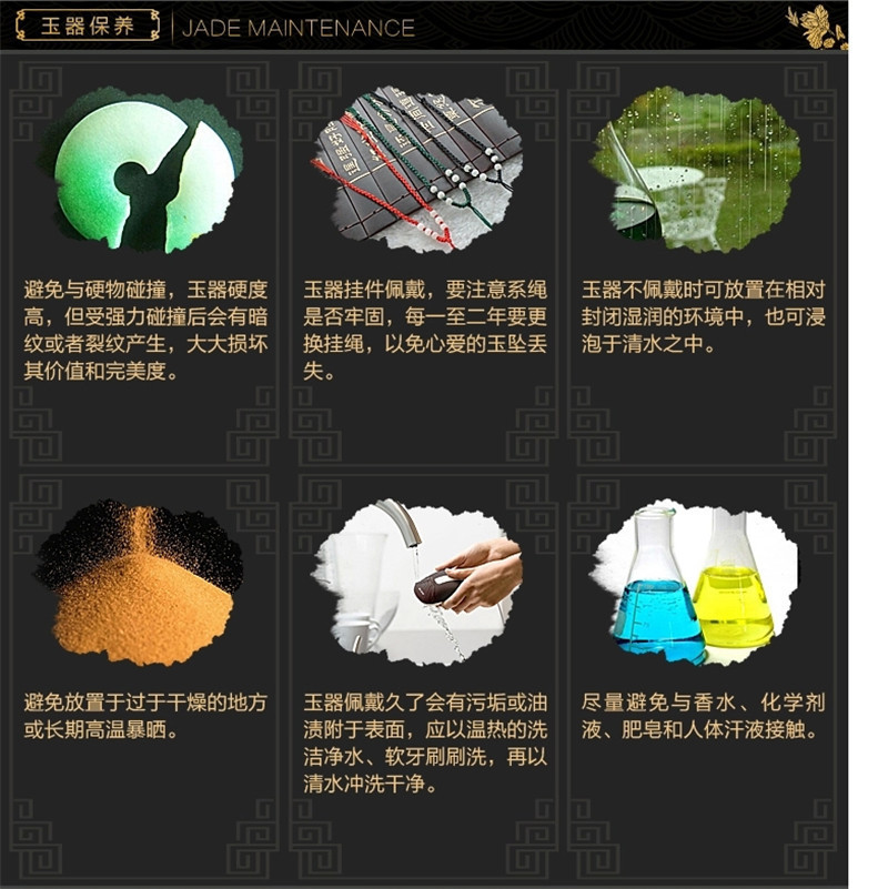 保養(yǎng)小知識:應(yīng)避免與硬 物碰撞或高空摔落,防止撞裂或摔破飾體;應(yīng)避免存放在高溫下或明火燒灼,以免丟失溫潤的水份;鑲嵌的翡翠飾品應(yīng)經(jīng)常清洗,保持飾品的光潔和亮澤。鑲嵌的金屬物 質(zhì)年久失去光澤時(shí)可以到廠家或?qū)I(yè)維修處拋光處理 。長期不佩戴的翡翠飾品,每年可放在清水中保養(yǎng)一次,擦干水后,再適量涂點(diǎn)植物油進(jìn)行保養(yǎng),以更好滋養(yǎng)翡翠溫潤的靈性;儲(chǔ)藏翡翠首飾,一般要單獨(dú)包裝,切忌和其它首飾混藏在一起,避免磨損