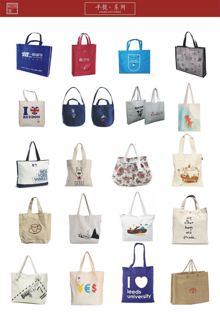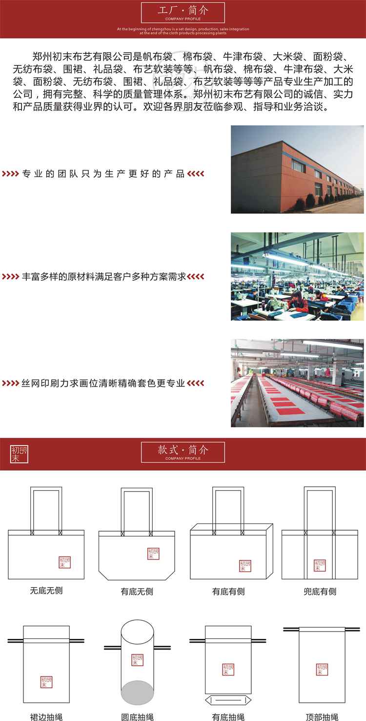 公司目前主營(yíng)產(chǎn)品有帆布袋、棉布袋、麻布袋、無(wú)紡布袋、牛津布公文包、帽子、T恤、圍裙八個(gè)類別。