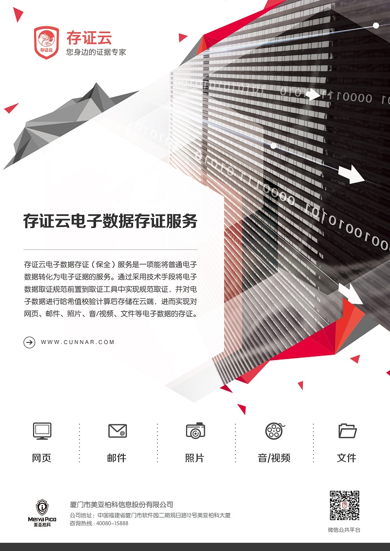存證云電子數(shù)據(jù)存證(保全)服務是一項能將普通電子數(shù)據(jù)轉(zhuǎn)化為電子證據(jù)的服務。通過采用技術(shù)手段將電子數(shù)據(jù)取證規(guī)范前置到取證工具中實現(xiàn)規(guī)范取證,并對電子數(shù)據(jù)進行哈希值校驗計算后存儲在云端,進而實現(xiàn)對網(wǎng)頁、郵件、照片、音/視頻、文件等電子數(shù)據(jù)的存證(保全)。