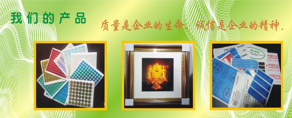 主營產(chǎn)品:防偽標(biāo)簽,不干膠商標(biāo),鐳射標(biāo)簽,激光防偽標(biāo),全息標(biāo)簽,全息圖藝術(shù)品,3D光柵片,VOID防偽標(biāo),特種印刷,數(shù)碼查詢商標(biāo),燙印標(biāo)簽,洗鋁漏空標(biāo)簽,流水號(hào)防偽標(biāo),等等。