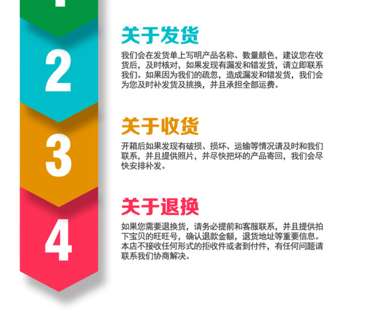 當(dāng)您收到包裹的時(shí)候,請不要急于在收貨單上簽字,請一定要當(dāng)著快遞人員的面打開當(dāng)場驗(yàn)貨,如寶貝有損壞或數(shù)量缺少請一定拒收!并當(dāng)場聯(lián)系掌柜(快遞單上有聯(lián)系電話)。一旦簽字即表示您對(duì)貨品的數(shù)量內(nèi)容及完好性予以認(rèn)可,掌柜將無法為買家們向快遞公司索賠了!也請恕本店不再承擔(dān)由貨品內(nèi)容不符、缺少或者損壞造成的損失!收到物品后有任何問題請及時(shí)聯(lián)系我們!掌柜與買家一起解決問題。讓買家百分百滿意而歸!最后,祝買家在本店購物愉快!