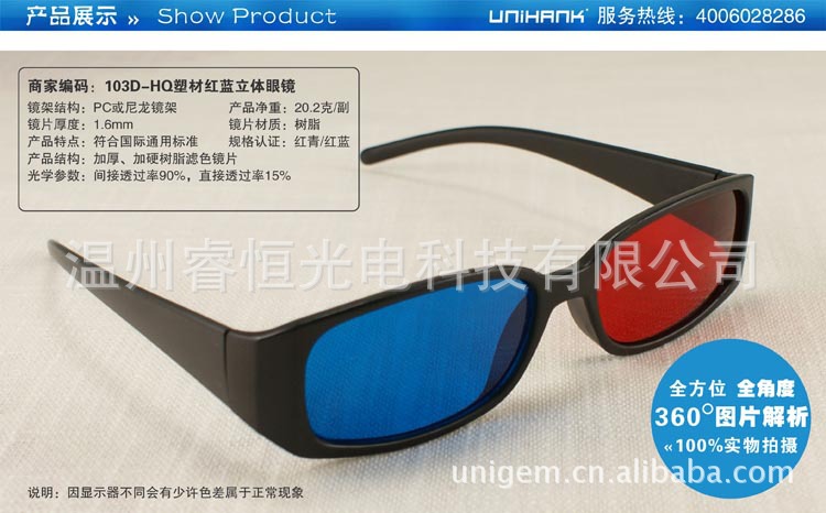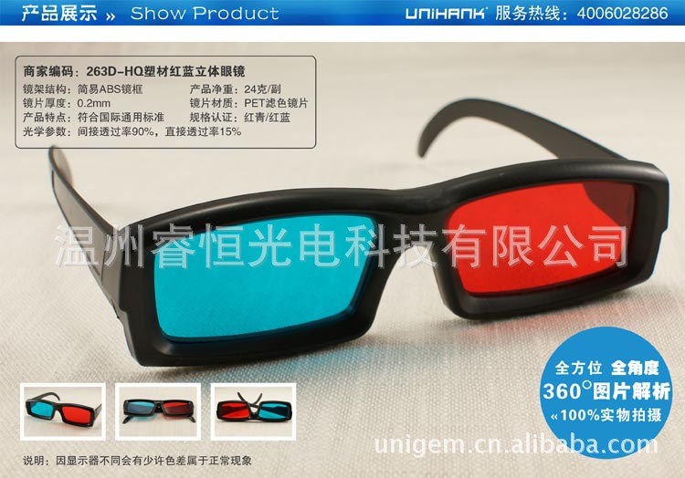 250克四色彩印單銅紙對裱,0.2MM PET過濾色片.特定原理裝配,色彩,圖文,外形可隨客戶需求制做.紙材紅青眼鏡廣泛應(yīng)用于立體圖書,立體劇場等大眾場所,為一次性使用工具.適用范圍:3D影視教材,科教醫(yī)療3D器材,3D影院,家庭3D電視,3D電腦游戲,3D圖書.3D報紙.3D立體副,3D立體廣告等