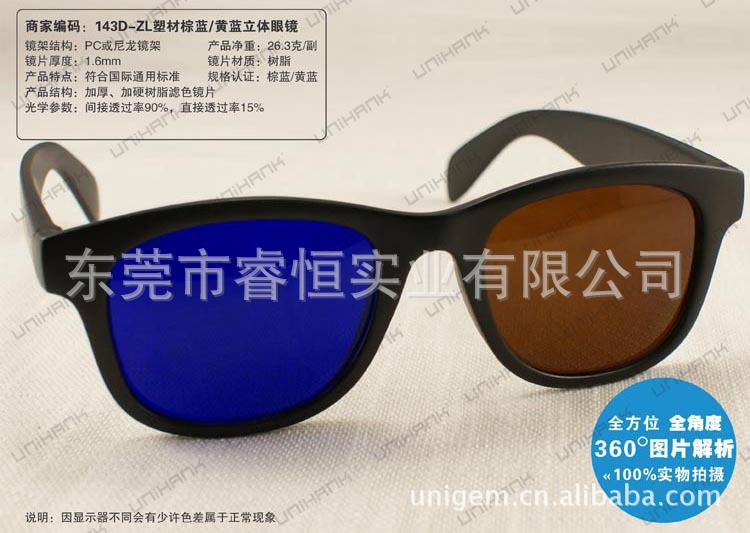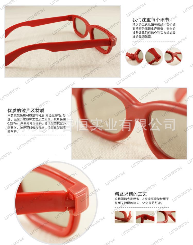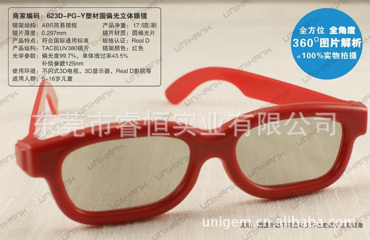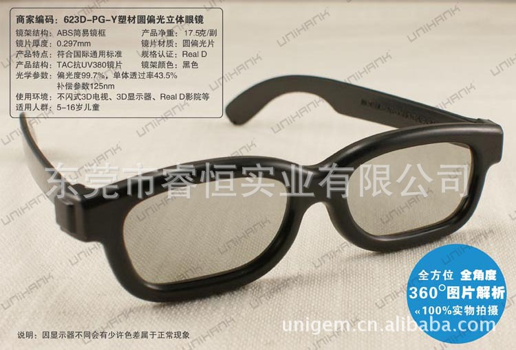 ABS鏡框.0.297MMTAC偏光鏡片,并做UV380處理,雙面TAC復(fù)合并加硬. 是配合立體電影.立體電視使用的圓偏光立體眼鏡. 適用范圍:3D影院.家居3D電視,