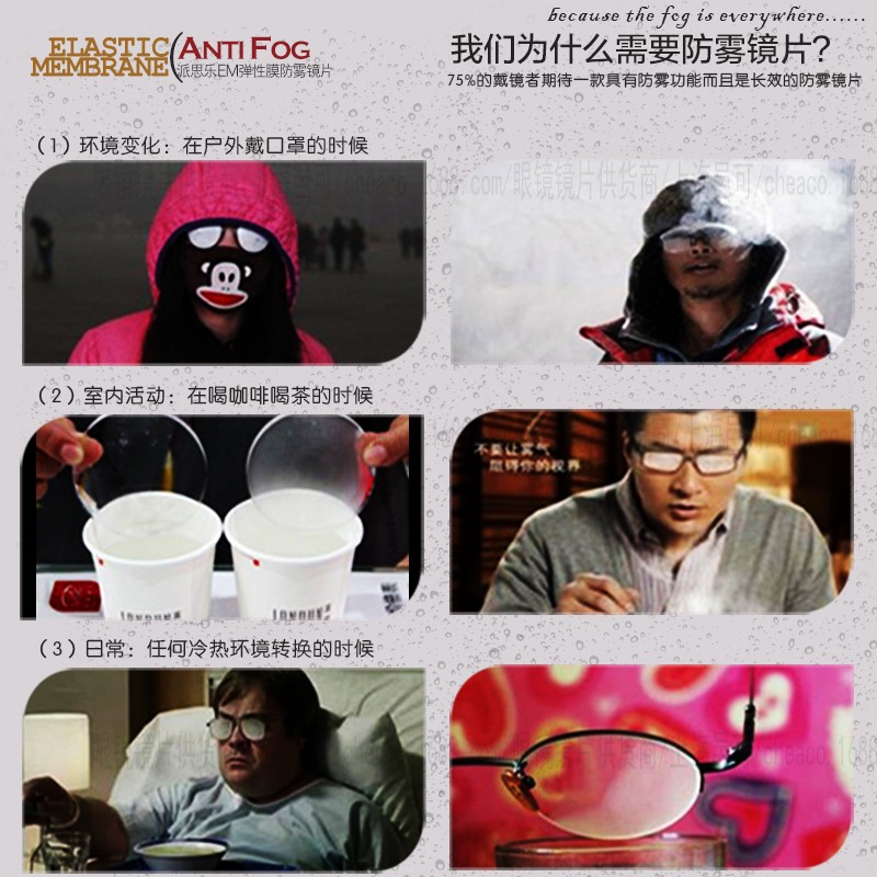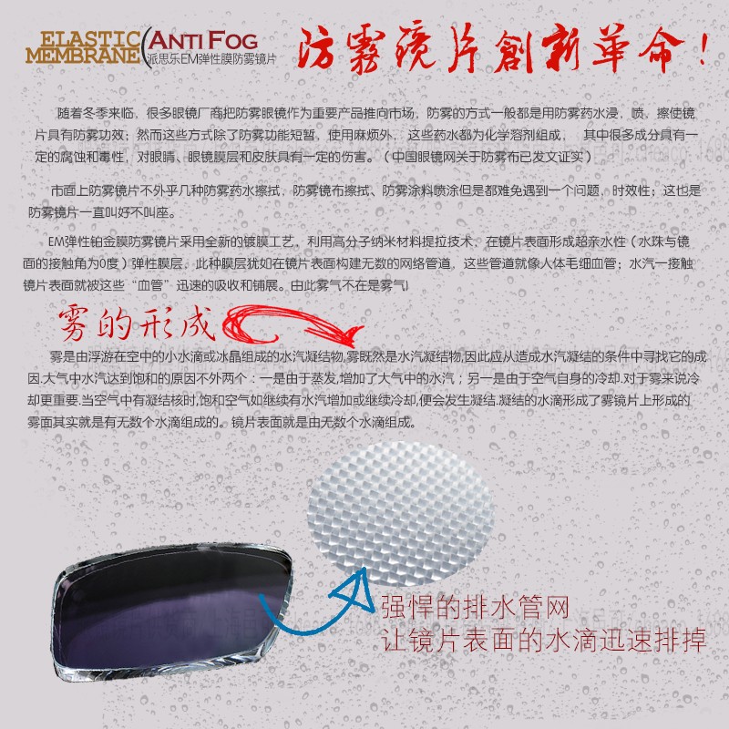 (彈性膜防霧原理:全新的鍍膜工藝,利用高分子納米材料提拉技術,在鏡片表面形成超親水性(水珠與鏡面的接觸角為0度)彈性膜層,此種膜層猶如在鏡片表面構建無數(shù)的網(wǎng)絡管道,這些管道就像人體毛細血管;水汽一接觸鏡片表面就被這些“血管”迅速的吸收和鋪展。由此霧氣不在是霧氣)