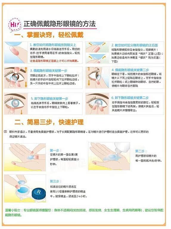 6、戴著隱形眼鏡只能滴隱形眼鏡專用的潤(rùn)眼液,其他眼藥水不僅使鏡片變硬、透明度下降,也會(huì)刺激眼睛。