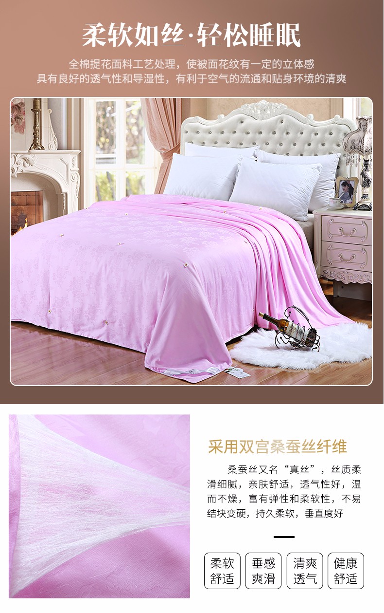 2、被芯如果沒蓋多久,就結(jié)塊,一團(tuán)團(tuán)集結(jié)成硬塊的被子當(dāng)然不保溫舒適,而桑蠶絲就能很好的解決這個(gè)問題,其超細(xì)纖維,決定了其柔順的本質(zhì),纖維分布有規(guī)律,用手觸摸明顯感覺絲滑,無硬塊。而柞蠶絲摸上去卻感覺干澀、粗硬,纖維分布不均。由國(guó)家質(zhì)監(jiān)總局發(fā)布的蠶絲被行業(yè)標(biāo)(GBT24242-2009)中,也對(duì)手感和硬塊等作了明確的指示,因此桑蠶絲做的被子,更細(xì)膩、耐用,更不易結(jié)塊。