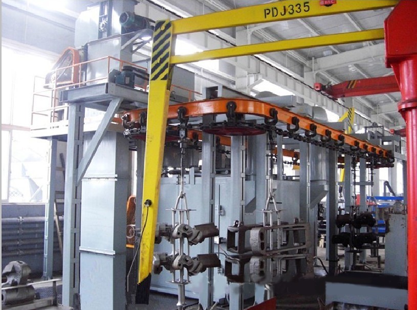 需拋丸處理的工件直接懸掛在吊鉤或掛架上,人工帶至拋丸室前部的牽引系統(tǒng),吊鉤自動進入拋丸室。吊鉤進入拋丸室后,拋丸室門將手動或氣動關閉,電氣聯(lián)鎖,以避免工件在拋丸室內進行拋丸處理時他人誤開拋丸室門?! 〉蹉^進入拋丸室在設定的區(qū)間位置作來回往復運動和自轉,使工件受到充分拋射,減少拋射死角?! 《€吊鉤、一個吊鉤在拋丸室內拋射,另一個吊鉤可裝卸工件?! ∵m用范圍:鋁合金壓鑄件、鋅合金壓鑄件、銅鑄件、不銹鋼精密鑄件、鑄鐵件、摩托車車架及鋼制品件的表面清理、光飾、強化。 特點: 1、參照拋丸機進行國產(chǎn)化制造?! ?、拋丸器采用直聯(lián)電機驅動,電機為變頻電機,可變頻調速。 3、鋼丸流量控制閥可微量調節(jié),氣動開啟與關閉。 4、采用世界上的芯筒脈沖反吹式除塵系統(tǒng)?! ?、電氣采用PLC控制 6、無地坑設計。 說明: 1、在標準機型中,拋丸機配有手動式懸掛系統(tǒng)?! ?、對于重型工件,拋丸機可選配電動葫蘆?! ?、拋丸室的門有氣動或手動啟閉。
