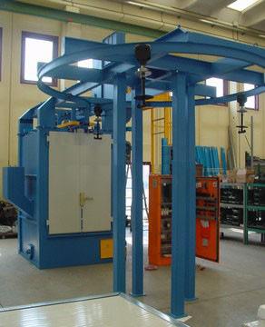 吊鉤式拋丸機(jī)分為單吊鉤和雙吊鉤,吊鉤式拋丸機(jī)由兩個(gè)吊鉤裝載工件交替進(jìn)入拋丸清理室內(nèi)。利用拋丸器將0.2~0.8的彈丸拋向工件的表面,使得工件的表面達(dá)到一定的粗糙度,讓工件變得美觀,或者改變工件的壓應(yīng)力提高壽命。本機(jī)型廣泛應(yīng)用于鑄造、建筑、化工、電機(jī)、機(jī)床等行業(yè)的中、小型鑄、鍛件的表面清理或強(qiáng)化處理。吊鉤式拋丸清理機(jī)為吊鉤式清理設(shè)備,由拋丸清理室、提升機(jī)、分離器、螺旋輸送器、兩個(gè)拋丸器總成、彈丸控制系統(tǒng)、吊鉤行走軌道、吊鉤系統(tǒng)、自轉(zhuǎn)裝置、地基、除塵系統(tǒng)及電氣控制部分等組成。