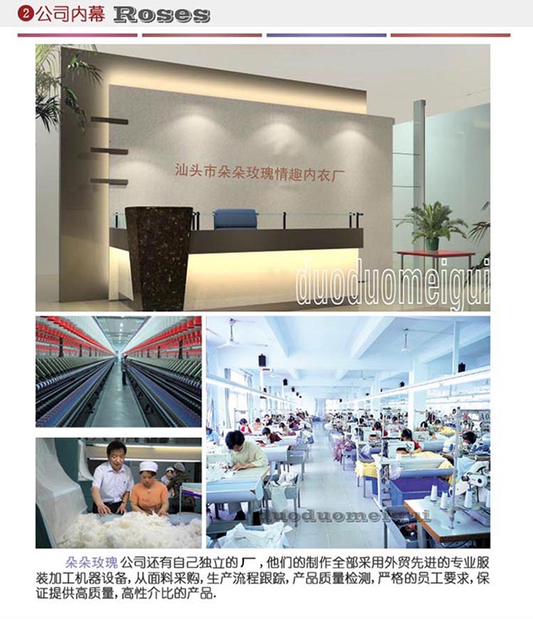 朵朵玫瑰情趣內(nèi)衣是一家集設(shè)計(jì)、生產(chǎn)、銷售、服務(wù)于一體的專業(yè)情趣內(nèi)衣服飾的企業(yè)。