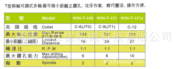 臺灣原裝精密T型兩軸可調多軸器,具有高精密,適應于各種組合機床,同時實多孔加工,生產效率高,適用于各種五金,壓鑄,汽車零件,電子,模具行業(yè)等機械加工。我們設有專業(yè)的團隊, 可根據客戶零件加工的需求,設計制造半自動化及自動化鉆孔攻牙切削專用機,提高工作效率。擁有完整、科學的質量管理體系;本公司的誠信、實力和產品質量獲得業(yè)界的認可。歡迎各界朋友蒞臨參觀、指導和業(yè)務洽談。