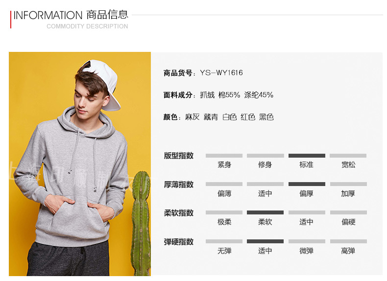 選擇一件好的衛(wèi)衣,重要的是面料的選擇,如果面料選擇不好,那么很容易失去衛(wèi)衣的功能性,市場(chǎng)上尤其是在一些網(wǎng)購(gòu)中所銷(xiāo)售的廉價(jià)衛(wèi)衣,大都是CVC面料的,就是我們平常所說(shuō)的滌棉,透氣性差,且會(huì)產(chǎn)生靜電,穿著非常的不舒服,還有一些甚至用化纖原料,那就更失去了衛(wèi)衣的保暖、透氣的特性了。我們這款衛(wèi)衣面料是采用純棉的面料,做出的衛(wèi)衣在舒適度的體驗(yàn)上是很好的,透氣不起球。我們秉承著用優(yōu)質(zhì)的品質(zhì),讓穿著更加舒適!