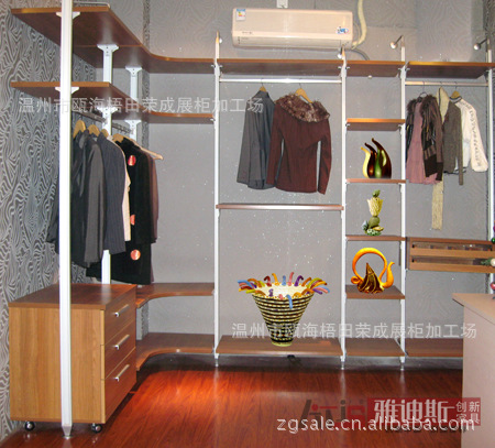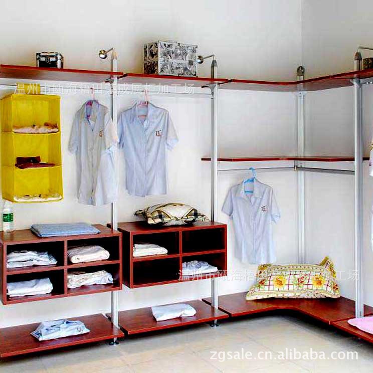 由不同規(guī)格的木板與連接五金件拼裝而成,比木榫連接更牢固。旋轉(zhuǎn)衣架、下拉式掛桿、各種功能性拉籃在此大顯身手,所有服飾都能在其中找到自己合適的“家”。