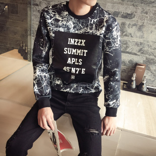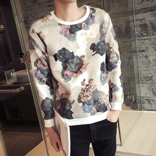 2015港風(fēng)秋裝型男夜店酒吧 休閑太空棉長(zhǎng)袖圓領(lǐng)玫瑰印花套頭衛(wèi)衣