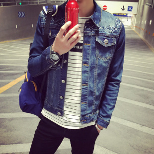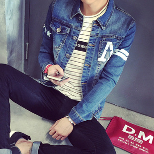 2015秋裝英文A印花個(gè)性大牌港風(fēng)休閑牛仔夾克男修身復(fù)古牛仔外套