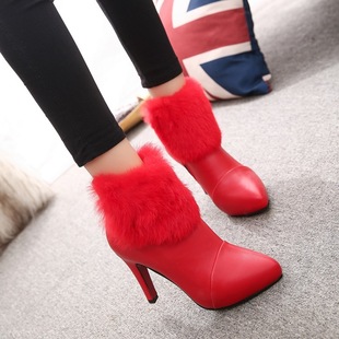 歐美秋冬新款真兔毛中跟短靴尖頭側(cè)拉鏈打蠟切爾西靴時尚細(xì)跟女靴¥ 55.00