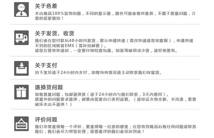 3、免責(zé)申明:不因少許線頭,可以去除的污點(diǎn),細(xì)微色差,以及沒有想象中漂亮,大,小,等主觀理由要求退換。