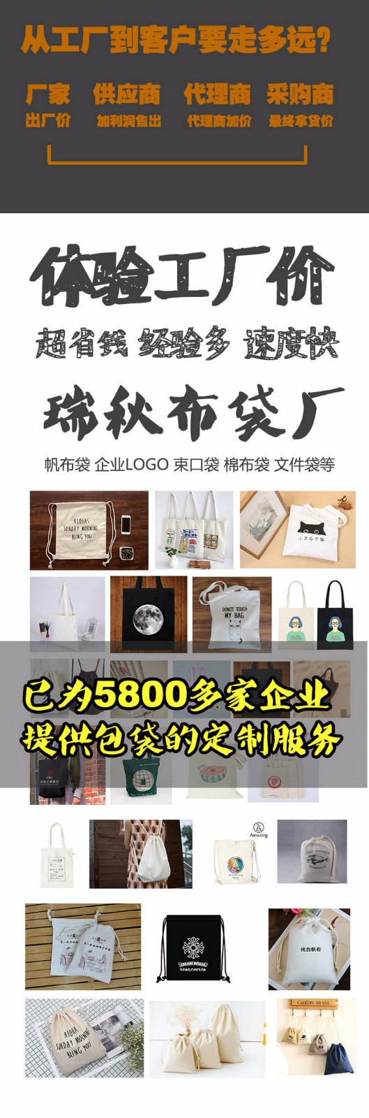 合肥瑞秋布袋廠(瑞秋布袋)是一家專業(yè)加工帆布袋,原創(chuàng)設(shè)計(jì)帆布袋,手工定制帆布袋,布藝手工制作,帆布袋DIY,大布袋子,帆布袋接單,帆布袋批發(fā),手袋束口袋加工,環(huán)保袋制作等的一家布藝手工加工廠.在消費(fèi)者當(dāng)中享有較高的地位,公司與多家零售商和代理商建立了長期穩(wěn)定的合作關(guān)系。合肥瑞秋布袋廠實(shí)力雄厚,重信用、守合同、保證產(chǎn)品質(zhì)量,以多品種經(jīng)營特色和薄利多銷的原則,贏得了廣大客戶的信任。