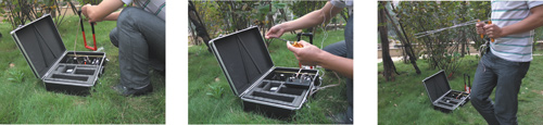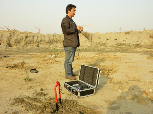 6.區(qū)域測試時,把發(fā)she器放在地面上,把發(fā)射天線連接到發(fā)she器的對應(yīng)的插孔內(nèi)。在發(fā)she器打開的時候。絕dui不要插拔發(fā)射天線,如果那樣做的話,將會對機(jī)器造成損壞,對操作人員造成嚴(yán)重傷害。在發(fā)she器的前面,挖一個小的壕溝,把發(fā)射天線埋到溝里,埋到黑線處。把頻率選擇設(shè)置到需要的位置。打開發(fā)she器,然后逆時針旋轉(zhuǎn)“水平”和“垂直”兩個旋鈕到最da處,然后再順時針旋轉(zhuǎn)著兩個兩個按鈕,直到它們上面對應(yīng)的兩個指示燈變亮(這個用來設(shè)置發(fā)she器適合地面情況)。在3到5分鐘之后,站到離發(fā)she器5到6米遠(yuǎn)處,像上面練習(xí)使用接收天線的時候一樣,圍繞這個發(fā)射天線做圓周運動,保持距發(fā)射天線的距離5到6米遠(yuǎn),如果這個區(qū)域沒有要找的目標(biāo)物,接受天線不應(yīng)當(dāng)交叉。