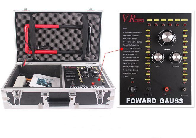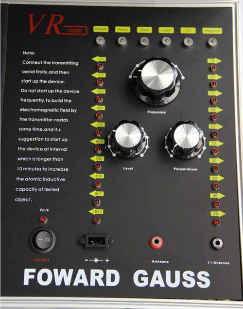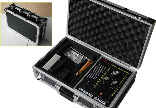 一個鑲有鋁邊并帶有把手和兩把鎖的黑色盒子,該盒子里裝有發(fā)she器和其它附件。該發(fā)she器是安裝在盒子里,發(fā)she器的面板上有六個LED頻率指示燈,且每個指示燈都代表某項功能,字母C開頭的表示銅,字母S開頭的表示銀,字母G開頭的表示金,字母L開頭的表示鉛,字母T開頭的表示錫,字母D開頭的表示寶石。在指示燈的下面有個頻率選擇開關(guān),可以自由調(diào)節(jié)您所需要探測的金屬種類。頻率選擇開關(guān)的下面,有兩個旋鈕,分別標(biāo)有"水平"、"垂直"字樣,分別代表探測深度與范圍。左右各有一豎排十個指示燈,可以用水平或者垂直鈕來調(diào)節(jié)您所要選擇的探測深度和探測范圍(探測深度為5-50M,每5M一個指示燈共計十個,探測范圍為100-1000M,每100M一個指示燈共計十個)。主機(jī)面板最下方一排從左起為電源總開關(guān),電源充電孔,以及一紅一黑的兩個發(fā)射天線插孔。充電電路已經(jīng)被設(shè)計在儀器內(nèi)部,電池安裝在儀器中部的面板下面。(切記:充電時請先用大陸公司贈送的220V轉(zhuǎn)110V的轉(zhuǎn)換器插入家用電插座然后將充電器接插在轉(zhuǎn)換器上)