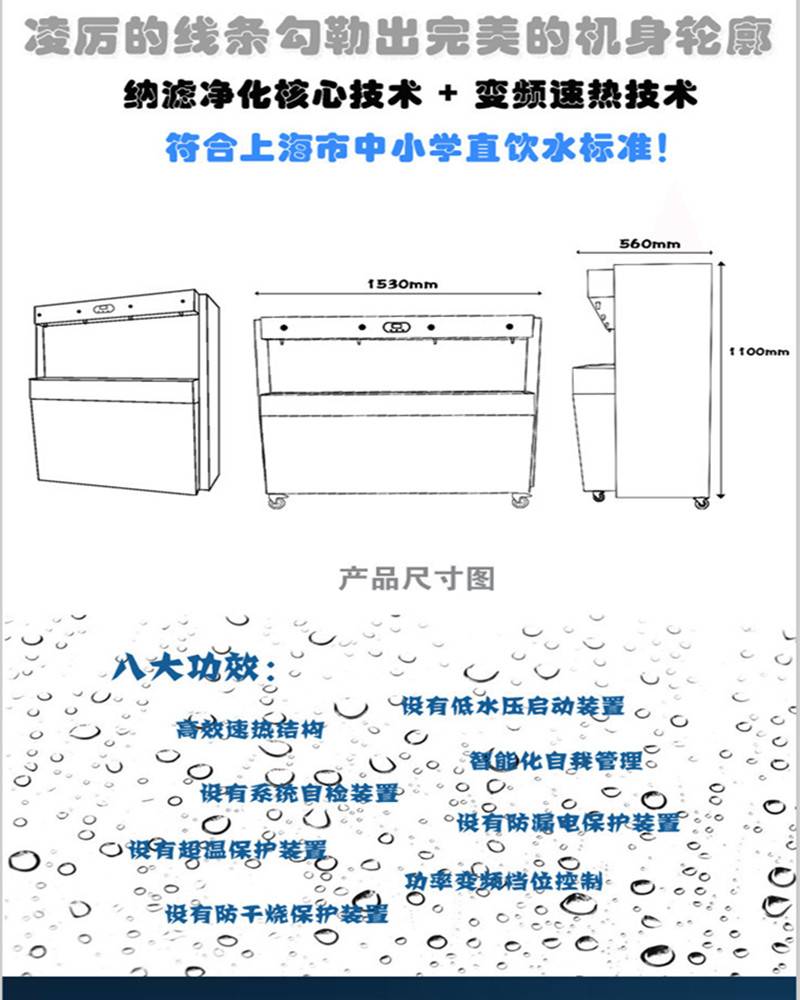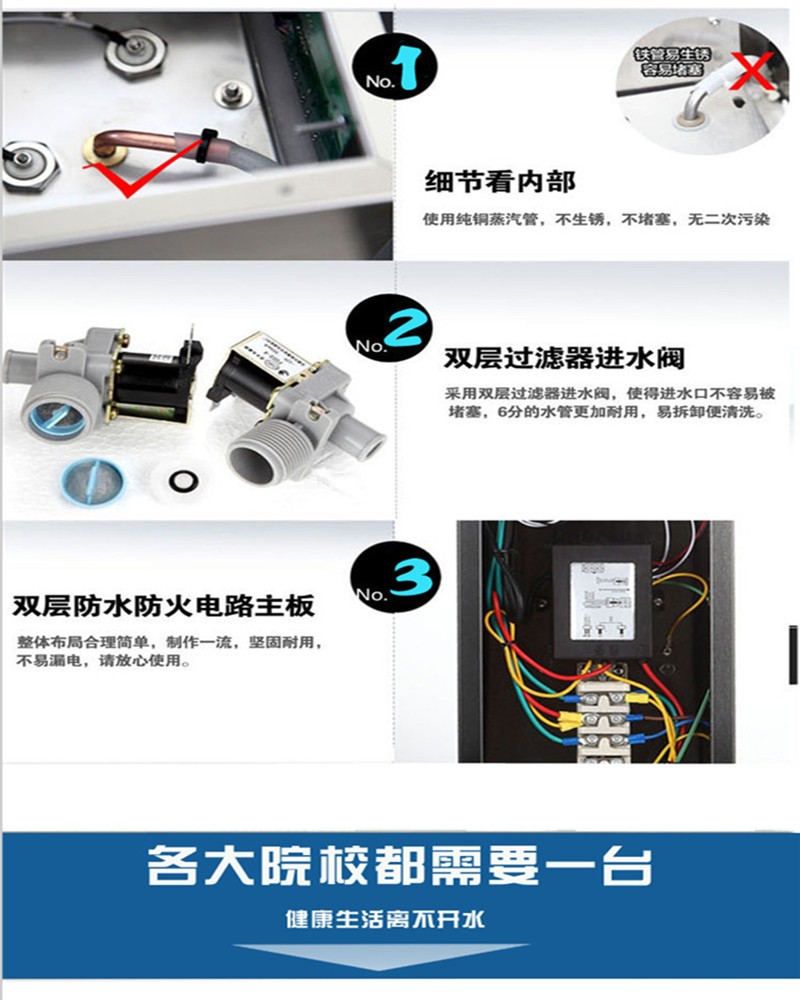 艾迪衛(wèi)校園飲水設(shè)備內(nèi)置RO反滲透凈水器,凈化后的水和超市里買的娃哈哈、怡寶的水質(zhì)是一樣的,非常安全,熱回收加熱讓能耗一降再降,因?yàn)楹⒆雍人珶崤聽C著,冷了怕感冒,所以艾迪衛(wèi)設(shè)置了可調(diào)式溫度,不管冬天還是夏天想調(diào)多少度就調(diào)多少度,定時(shí)開關(guān)機(jī)讓能耗一降再降,按鍵式出水開關(guān),方便操作,打破了旋轉(zhuǎn)開關(guān)冬天因結(jié)冰擰壞閥芯的隱患,防干燒和故障提示會(huì)在顯示屏上都能體現(xiàn),機(jī)器內(nèi)部有漏電保護(hù)裝置,我們安裝時(shí)會(huì)在機(jī)器外部在安裝一個(gè)漏電保護(hù)器,這樣會(huì)雙重保護(hù)確保萬(wàn)無(wú)一失,質(zhì)量由中國(guó)財(cái)產(chǎn)保險(xiǎn)公司承保!