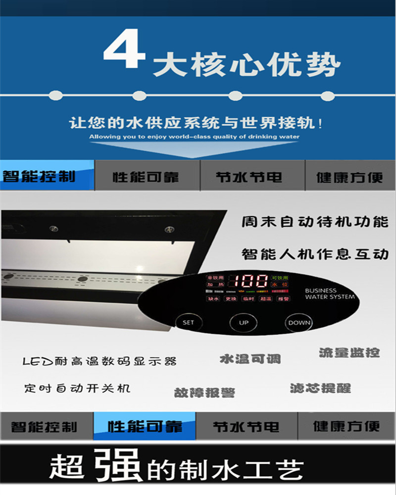 耐高溫的顯示屏,更加清楚的顯示機(jī)器工作狀態(tài)(北京時(shí)間、溫度、是否可飲用、定時(shí)開關(guān)機(jī)、加熱模式、水位狀態(tài)、補(bǔ)水缺水狀態(tài)、流量監(jiān)控、臨時(shí)運(yùn)行、缺水超溫報(bào)警等)都非常直觀的顯示出來(lái),方便人機(jī)交流, 整個(gè)機(jī)器控制,都采用電腦主板來(lái)進(jìn)行智能化管理,做到無(wú)人值守,自我管理;